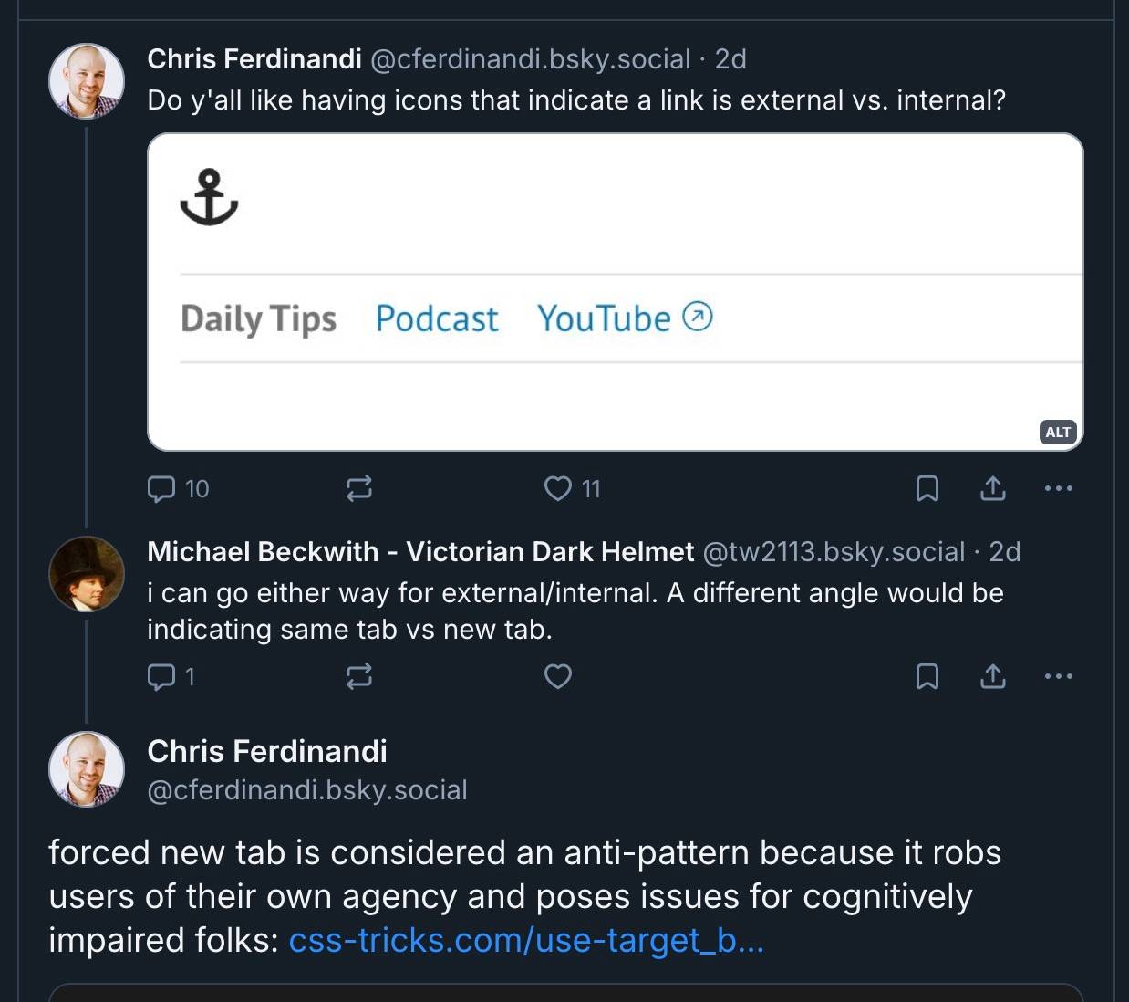 Our discussion ended with an agreement that it's OK to "right click" to open a new tab if we, the user, see fit. If anyone wants to weigh in on the discussion, please feel free to let me know on BlueSky or X what your thoughts are.